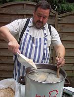 Dann steht Werner wieder - eine gestreifte Schürze um den Leib gebunden - an seinem grauen 25-Liter-Einmachtopf Marke 'Kochstar', prüft mit einem Thermometer die Temperatur des dampfenden Sudes, tut einige Ingredenzien hinein, rührt um -und wartet.