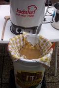 Anschließend wird der Nachguss, 75 Grad heißes Wasser, auf die Maische geschüttet, um weitere lösliche Bestandteile aus den festen Teilen der Maische herauszulösen.